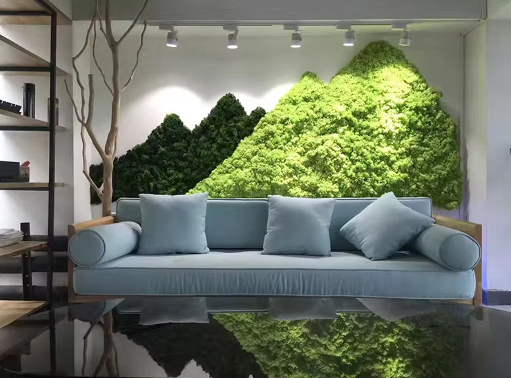 Living walls look and feel vibrant but require irrigation, plant care, and lighting design. Preserved moss solves the maintenance gap for interiors with limited light, limited access, or tight operating budgets. It is real botanical material that keeps its softness and color for years without water or soil. It is ideal for reception backdrops, huddle spaces, phone booths, and long corridors where service access is difficult.