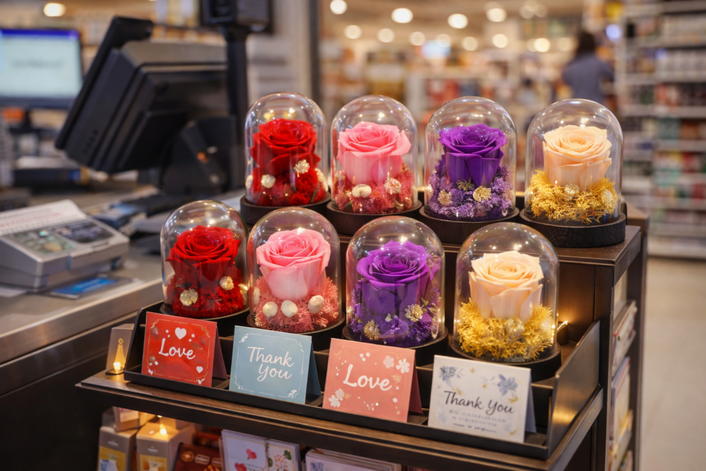 A small preserved flower gift is not only competing with another flower product. It is competing with chocolate, greeting cards, candles, beauty minis, plush toys, gift cards, seasonal decorations, and every other item that says, “Pick me up while you are already here.”