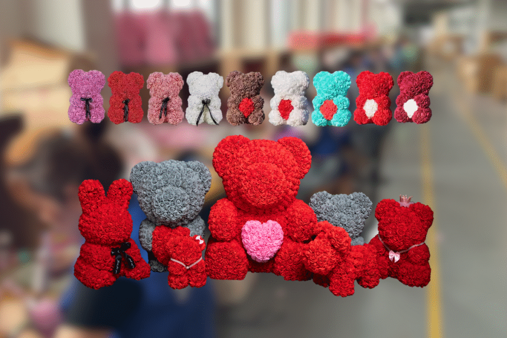 Sweetie Gifts manufactures PE rose bears in our Yiwu facility with full QC and packaging support. We offer standard colors, custom ribbons and cards, and export ready packing. If you would like samples or a current catalog, contact inquiry@sweetie-group.com.